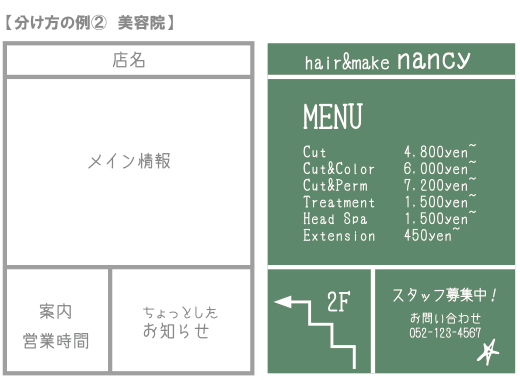 ・・・を考えて、お店の看板を区切ってみてはいかがでしょう?